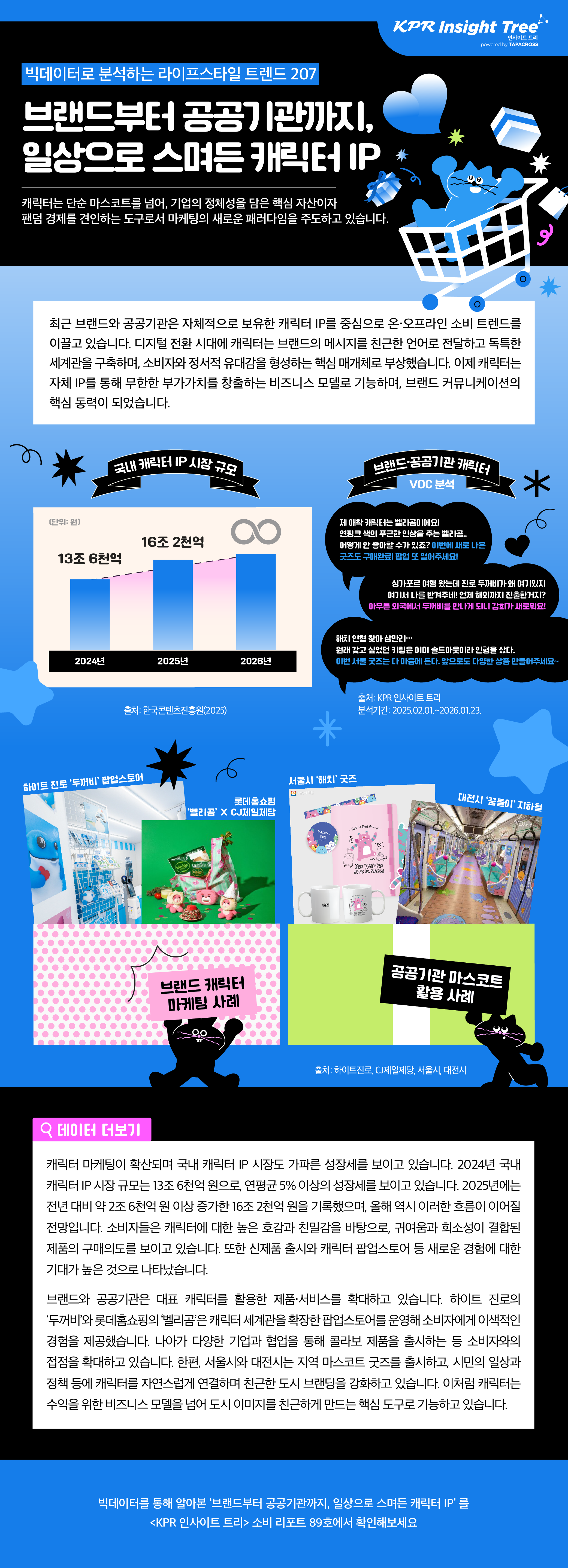 최근 브랜드와 공공기관은 자체적으로 보유한 캐릭터 IP를 중심으로 온·오프라인 소비 트렌드를 이끌고 있습니다. 디지털 전환 시대에 캐릭터는 브랜드의 메시지를 친근한 언어로 전달하고 독특한 세계관을 구축하며, 소비자와 정서적 유대감을 형성하는 핵심 매개체로 부상했습니다. 이제 캐릭터는 자체 IP를 통해 무한한 부가가치를 창출하는 비즈니스 모델로 기능하며, 브랜드 커뮤니케이션의 핵심 동력이 되었습니다.