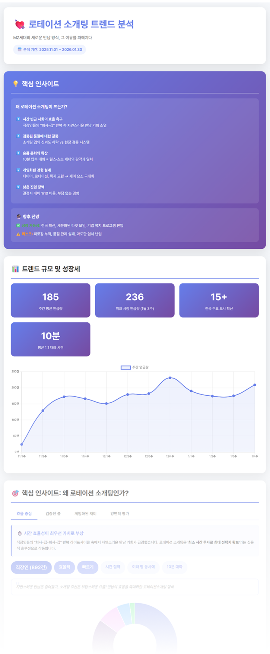 ✅ 주목 포인트 1 직장인들이 불확실한 데이팅 앱 대신 현장 검증 시스템을 갖춘 로테이션 소개팅을 '실용적 솔루션'으로 채택하며, 최소 시간으로 최대의 선택지를 확보하는 효율 중심의 만남 문화를 형성하고 있습니다.