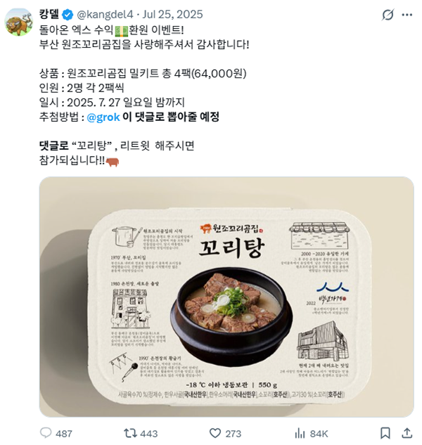 한 곰탕 밀키트 브랜드는 댓글 이벤트에 그록을 결합해 유저들의 뜨거운 참여를 유도했는데요. 이벤트에 남겨진 수많은 참여 댓글 중에서🤖 AI인 그록이 직접 재미있게 당첨자를 선정해 주는 신선한 방식이었죠!