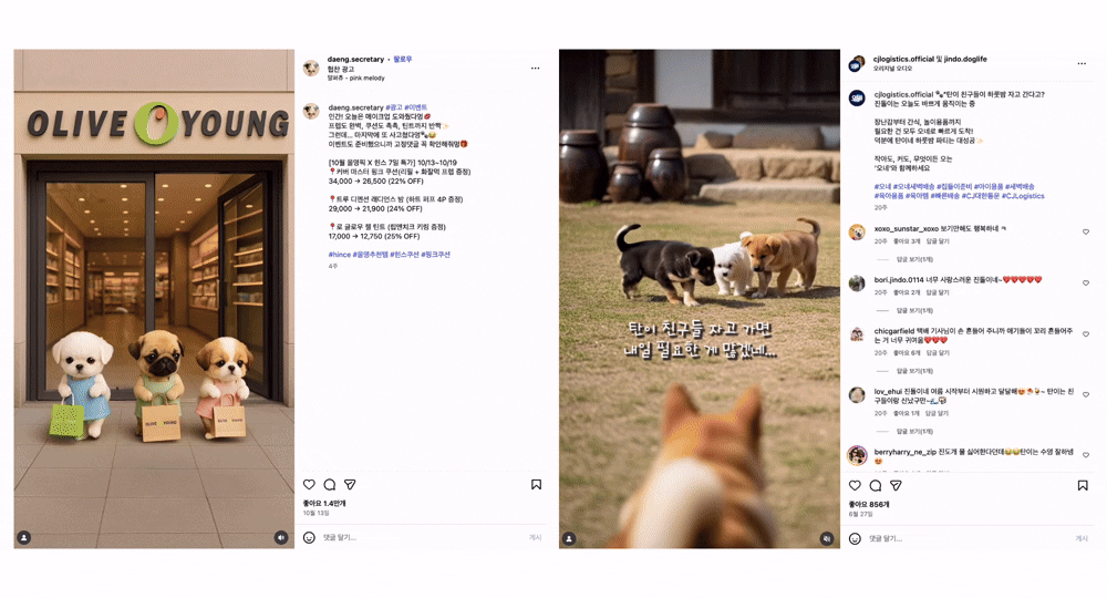 기업들도 이 점에 주목하고 있어요. 실제로 ‘요리하는 진돗개 진도’, ‘방구석 관리사 말퍼츄’, ‘정서불안 김햄찌’ 같은 AI 동물 크리에이터와 협업해 숏폼을 제작하는 사례도 눈에 띄게 늘고 있죠. AI 동물 크리에이터를 활용하면 브랜드 메시지를 부담 없이 전달할 수 있을 뿐 아니라, 제품 노출까지 자연스럽게 녹여낼 수 있어요. 덕분에 앞으로도 더 많은 브랜드가 이 방식에 주목하게 될 것 같아요.