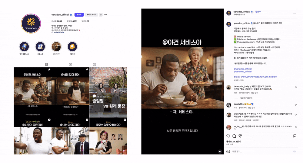 특히, 교육· 공익 캠페인 분야에서 눈에 띄는 성과를 보여주고 있어요. 예를 들어, ‘야나두 영어 회화 숏폼 시리즈’는 일상 속 상황을 AI 영상으로 구현해 실생활 영어 표현을 자연스럽게 학습하도록 돕고 있는데요. 이처럼 AI 스토리텔링은 브랜드가 전하고자 하는 메시지를 감정적으로 연결해, 더 높은 참여와 자발적인 확산까지 기대할 수 있는 방식으로 자리 잡아가고 있어요.