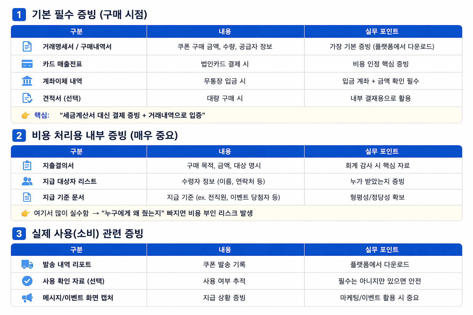 • 근로자의 날 모바일 쿠폰은 세금계산서가 아닌 증빙 구조로 비용 처리해야 하며, 실무 리스크를 줄이려면 지급 기준을 명확히 설계하고 선택형 선물 방식으로 만족도까지 함께 해결하는 것이 핵심입니다.