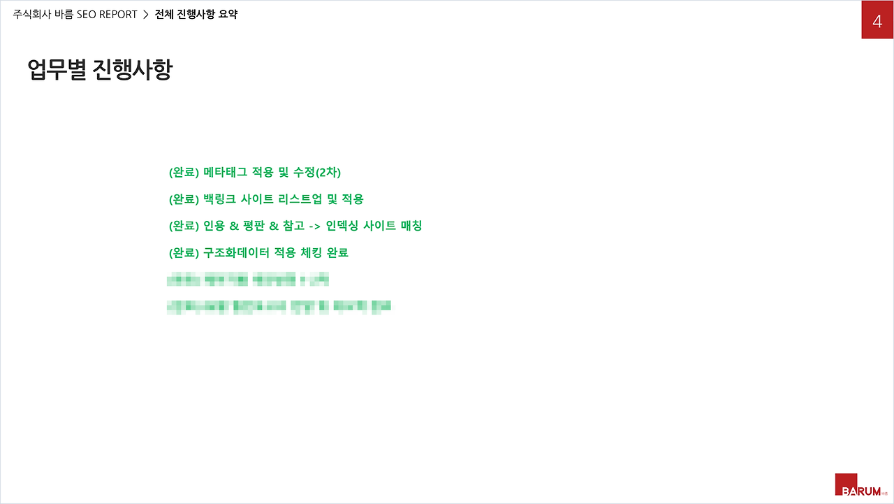초기 07월 보고서를 보면, 먼저 검색엔진이 사이트를 읽을 수 있도록 기본적인 정비 작업부터 시작했습니다. 완료 사항으로는 메타태그 적용 및 수정 2차, 백링크 사이트 리스트업 및 적용, 인용·평판·참고 사이트와 인덱싱 사이트 매칭, 구조화데이터 적용 체킹 완료, 페이지별 색인 반영 1~2차가 정리되어 있습니다. 이 단계는 눈에 띄는 성과를 과장하기보다, 검색엔진이 사이트를 인지하고 페이지를 받아들일 수 있도록 바닥 작업을 하는 단계에 가깝습니다. 실제로 보고서 안에서도 콘텐츠 SEO를 통해 인용·평판·참조 지표를 높이는 것도 중요하지만, 실질적으로 검색 시 키워드를 잡는 작업이 가장 우선이므로 빠른 배포와 적용이 필요하다고 적혀 있습니다.