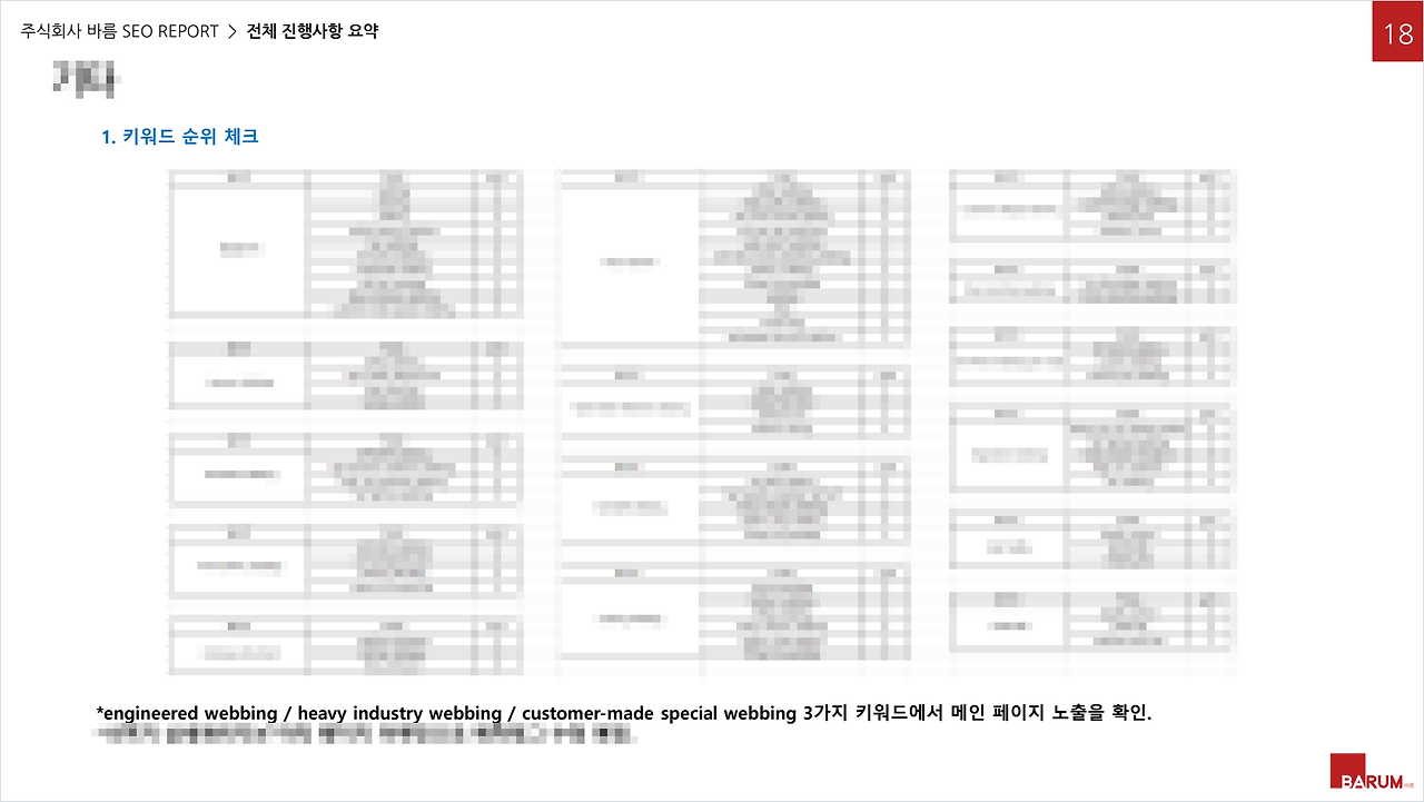 초기 보고서에서는 engineered webbing, heavy industry webbing, customer-made special webbing 세 가지 키워드에서 메인 페이지 노출이 확인되었다고 정리되어 있습니다.