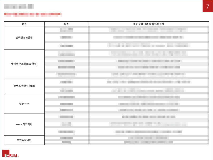 보고서에는 인덱싱과 크롤링, 데이터 구조화, 콘텐츠 연관성, 성능과 UX, URL과 아키텍처, 보안과 다국어 영역까지 항목별로 상세한 수행 내용과 최적화 전략이 정리되어 있습니다. 여기서 중요한 것은, GEO가 막연한 개념으로 다뤄지지 않는다는 점입니다. 실제로 어떤 데이터 구조를 넣고, 어떤 URL 체계를 만들고, 어떤 식으로 페이지 관계를 정리해야 하는지가 꽤 구체적으로 제시됩니다.