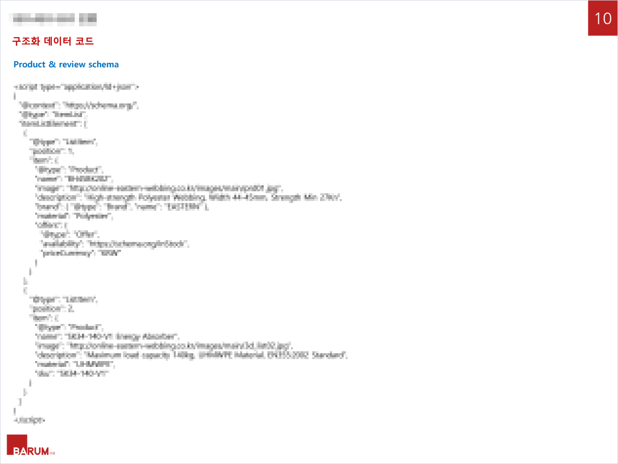 보고서에는 Product Schema를 통해 가격, 재고상황, SKU, MPN, 브랜드 정보 등을 마킹하여 AI가 상품 스펙을 정확히 인지하도록 하는 방향이 적혀 있고, Review Schema는 AI 추천 엔진의 핵심 신뢰 지표로 설명됩니다.